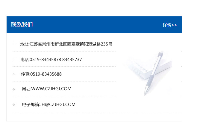 地址:常州市新北區友邦商務大廈1幢16、17層  電話:0519-85101652  傳真:0519-85112595  郵編:213022  網址:www.cz-jiayue_cn.ntdggy.com  郵箱:xiajifengaa@163.com